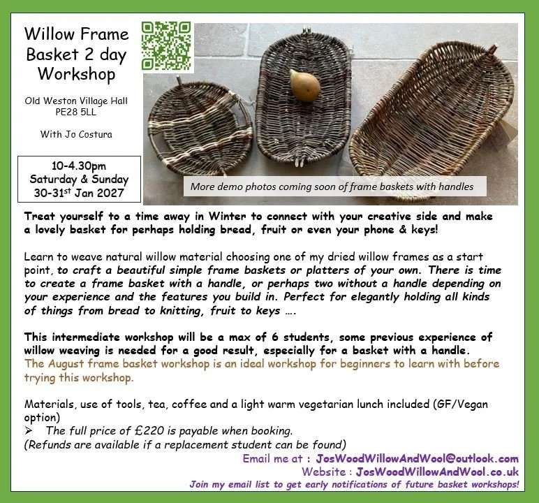 Learn to weave natural willow material choosing one of my dried willow frames as a start point, to craft a beautiful simple frame baskets or platters of your own. There is time to create a frame basket with a handle, or perhaps two without a handle depending on your experience and the features you build in. Perfect for elegantly holding all kinds of things from bread to knitting, fruit to keys ….